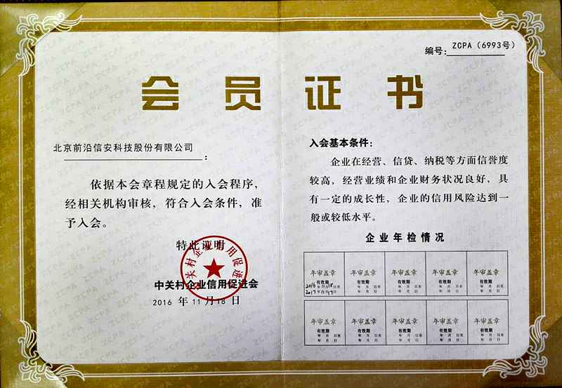中关村企业信用促进会会员证书